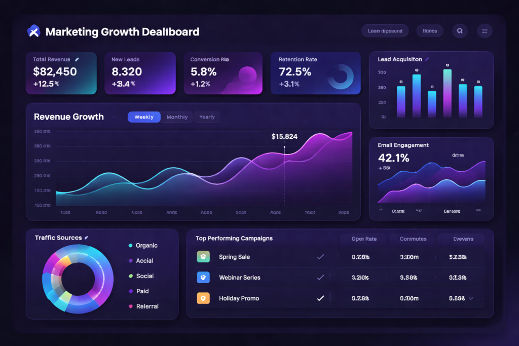 Monthly dashboards covering leads, ROAS, cost per acquisition and organic growth – zero vanity metrics.